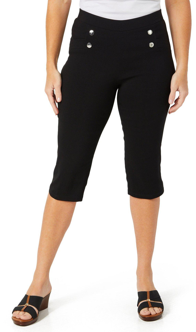 These skimmer capris feature a sleek design with faux front and back pockets for a smooth flattering fit. Comfortable and easy to style theyre perfect for everyday wear from morning to night. Inseam measures approximately 18 in. Fabrication is 76% rayon, 21% nylon, 3% spandex.