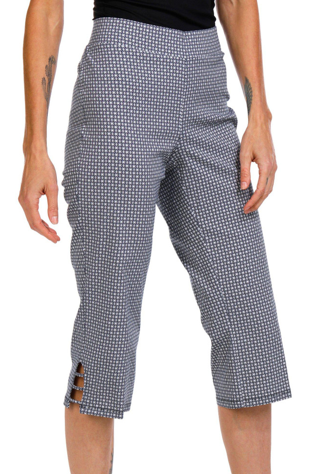 Step into easy style with these Pull On Capris, featuring a comfort waist and charming ladder hem detail. Perfect for everyday wear, they offer a flattering fit and breezy feel for warm weather days. Inseam measures approximately 21 in. Fabrication 76% rayon, 21% nylon, 3% spandex.