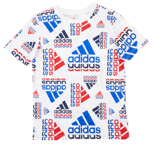 This adidas shirt features an all-over logo pattern in bold red, blue, and white for a standout look. Designed with a classic crew neck and short sleeves, it blends sporty style with everyday comfort. Perfect for active wear or casual outings, this shirt adds energy and color to any wardrobe.