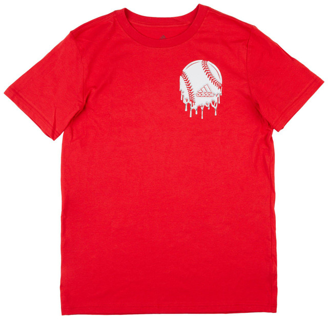 This adidas big boys crew neck tee is made for kids who bring heat to the game and style to the streets. Crafted from 100% soft cotton, its built for all-day comfort and movement. The short sleeves and classic fit make it a staple for any wardrobe, but what really sets it apart is the bold graphica melting baseball design that drips with attitude. Its not just a shirt, its a statement. Perfect for boys who live loud, play hard, and dress like they mean it.