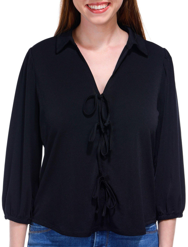 Add a touch of elegance to your wardrobe with this 3/4 Sleeve Top, featuring charming bow front details and elastic cuffs. The bow accents provide a feminine flair, while the elastic cuffs ensure a comfortable and secure fit. Crafted from soft, breathable fabric, this top is perfect for both casual and dressy occasions. Fabrication is 95% polyester, 5% elastane.