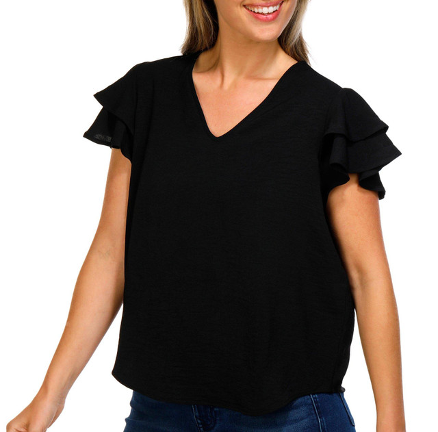 Effortlessly elegant, this Womens Double Flutter Sleeve Top is crafted from 100% polyester for a lightweight, breathable feel. Featuring a chic solid color, flattering v-neckline, and double-layer flutter sleeves, it adds a touch of feminine charm to any outfit. Perfect for both casual and dressy occasions.