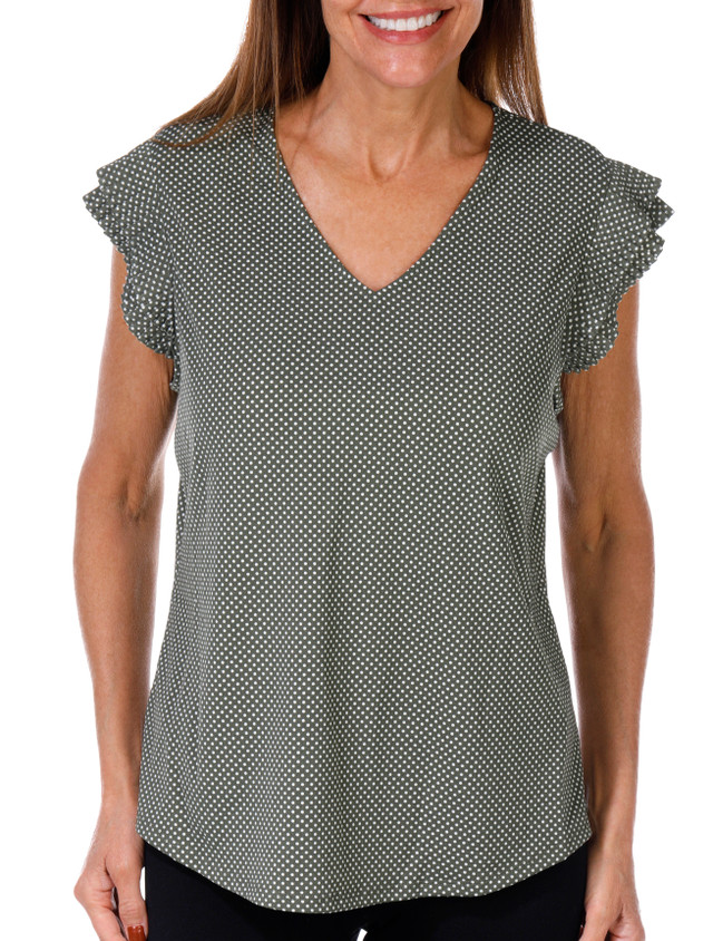 This womens short sleeve top features double pleated sleeves and a v-neckline. Made from lightweight crepe material with a playful dot pattern, it offers a stylish and comfortable look for any occasion. Fabrication is 93% polyester and 7% elastane.