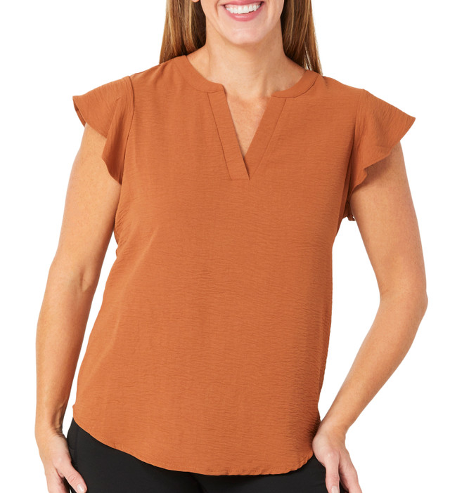 Soft and fluttery this womens cap sleeve top features a split neck and lightweight fabric for breathable comfort. Designed for relaxed style it offers a flattering fit perfect for warm days or layered looks. A versatile piece with effortless charm. Fabrication is 100% polyester.