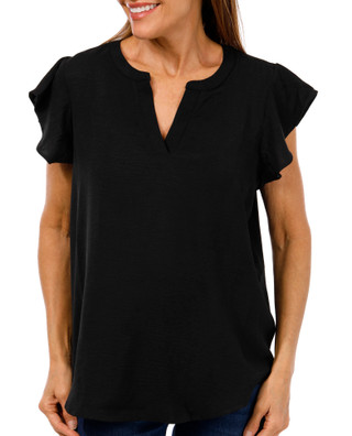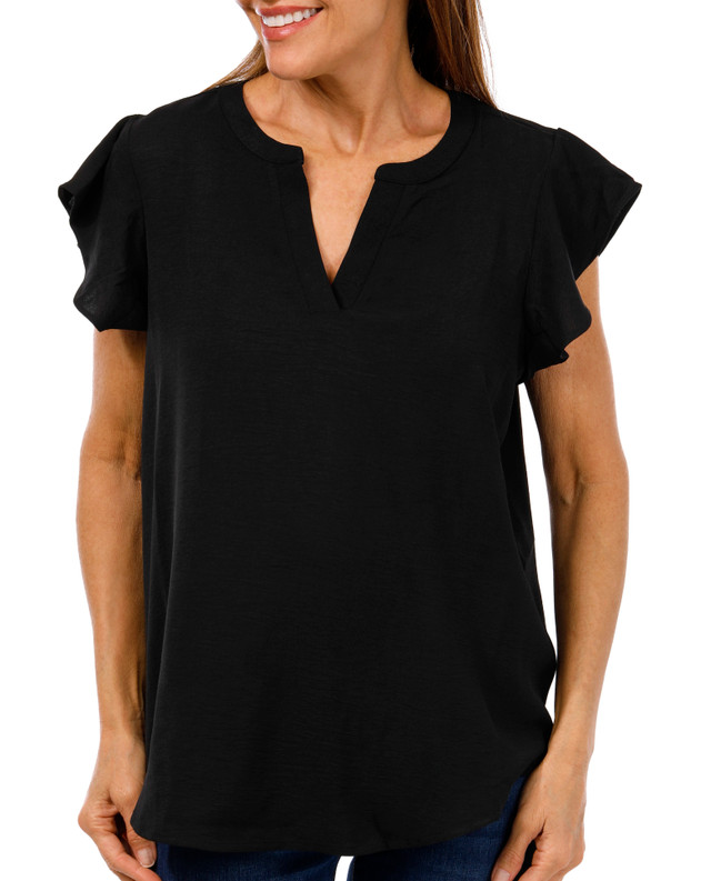 Soft and fluttery this womens cap sleeve top features a split neck and lightweight fabric for breathable comfort. Designed for relaxed style it offers a flattering fit perfect for warm days or layered looks. A versatile piece with effortless charm. Fabrication is 100% polyester.