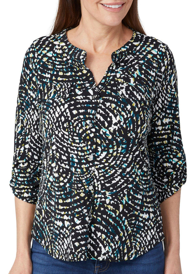 Introducing the Petite 3/4 Sleeve Seychelles Top, a perfect blend of polyester and spandex for a comfortable yet stylish fit. This top features a fun print, a button-down front, and a chic split neckline. The 3/4 roll tab sleeves add versatility, making it an ideal choice for work or casual outings. Elevate your wardrobe with this elegant and functional piece.