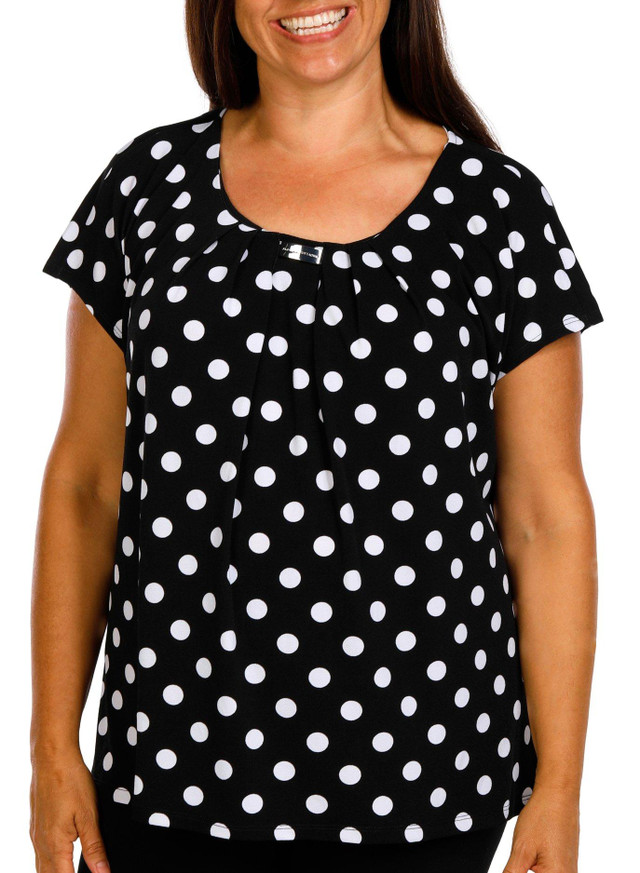 This women's polka dot dolman top features a classic scoop neckline and relaxed short sleeves for all day comfort. The polka dot print adds a touch of style while the easy fit makes it perfect for the office or casual outings. Fabrication 95% polyester, 5% spandex