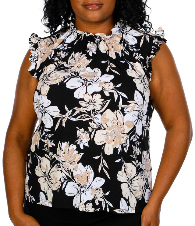 This plus size top features a chic floral print with short ruffle sleeves and a high neckline for a polished look. Its elegant design and comfortable fit make it a perfect choice for work or dressy daytime outings. Fabrication 95% polyester, 5% spandex