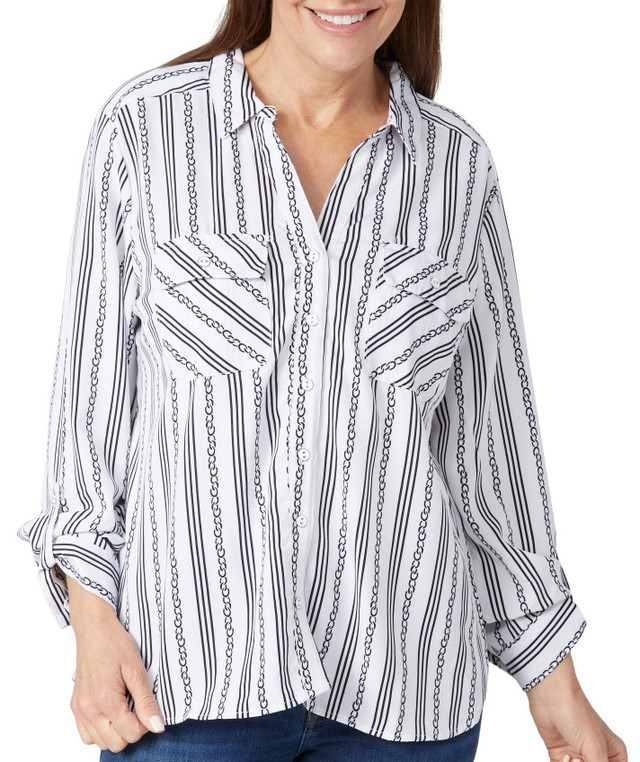 Introducing the Women's 3/4 Sleeve Silky Stripe Top, expertly crafted from a blend of polyester and spandex for a luxurious feel. This stylish top features a timeless striped print, a button-down front, and a classic collared neckline. The chest pockets add a touch of practicality, while the roll tab 3/4 sleeves offer versatile styling options. Perfect for both casual and professional settings, this top is a must-have addition to your wardrobe.