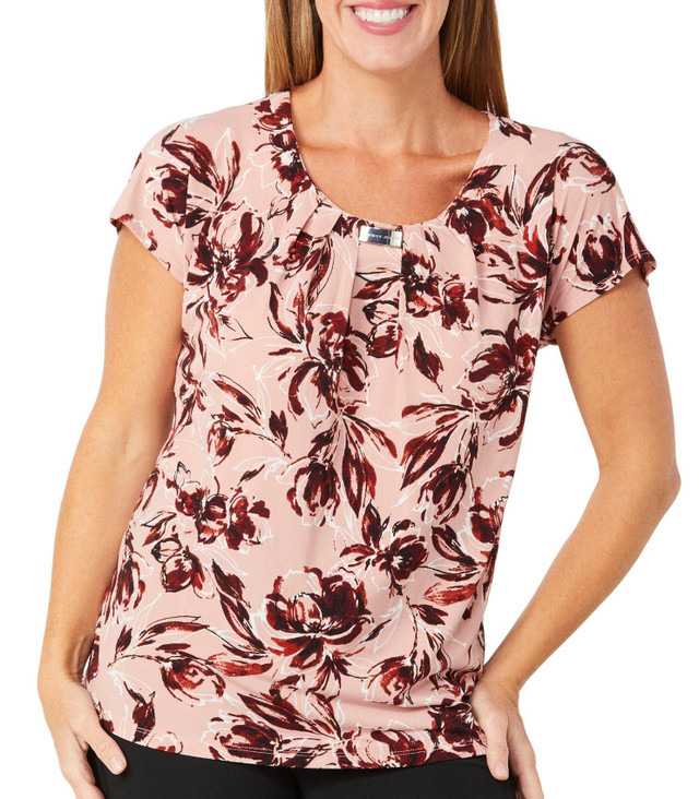 Stay comfortable in this womens short sleeve top made with loose fitting stretchy fabric for easy movement and all day wear. Designed for relaxed style it offers a flattering silhouette perfect for casual days or layered looks. Fabrication is 95% polyester and 5% spandex.