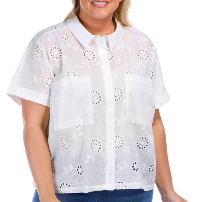 Elevate your casual wardrobe with this short sleeve button-down top that offers a soft and breathable fit. The classic button-down camp shirt design and stylish eyelet pattern make it a versatile piece, perfect for pairing with jeans or skirts. Whether you are dressing up for a casual outing or keeping it relaxed at home, this top combines comfort and timeless style effortlessly. Fabrication is 100% Cotton. Top length measures approximately 25 in.