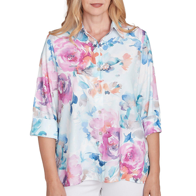 Alfred Dunner Petite 3/4 Floral Watercolor Button Down Top