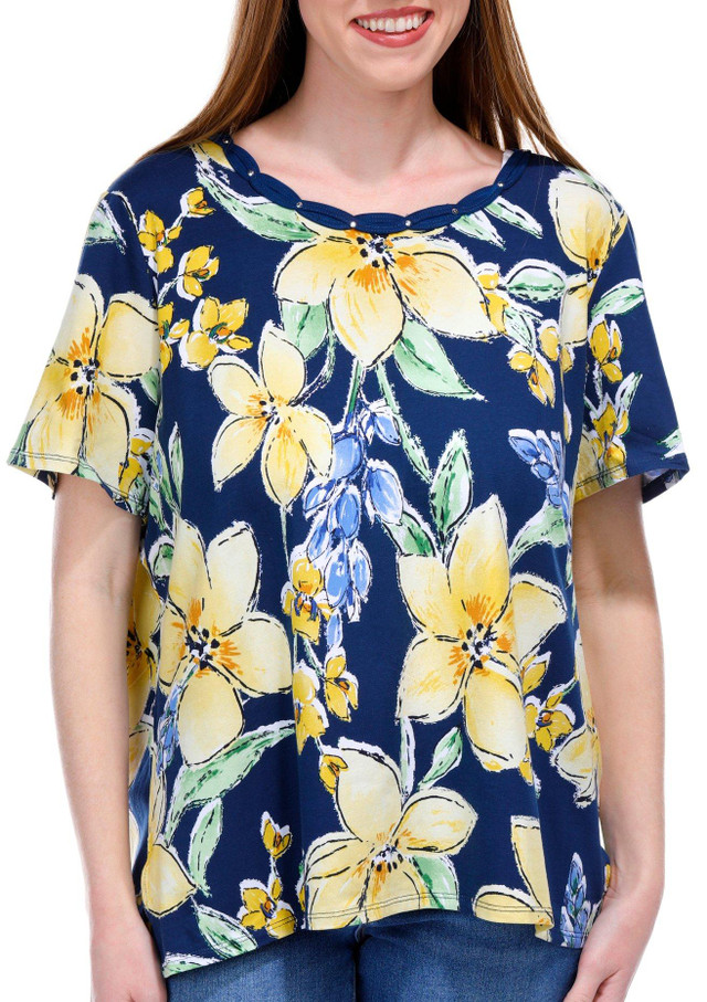 Add a pop of style to your wardrobe with this Womens Short Sleeve Print Top! Made from a soft blend of 95% cotton and 5% spandex, it offers a comfy, stretchy fit. With a flattering 22.5-inch length and a fun print, this top is perfect for effortless, everyday wear.