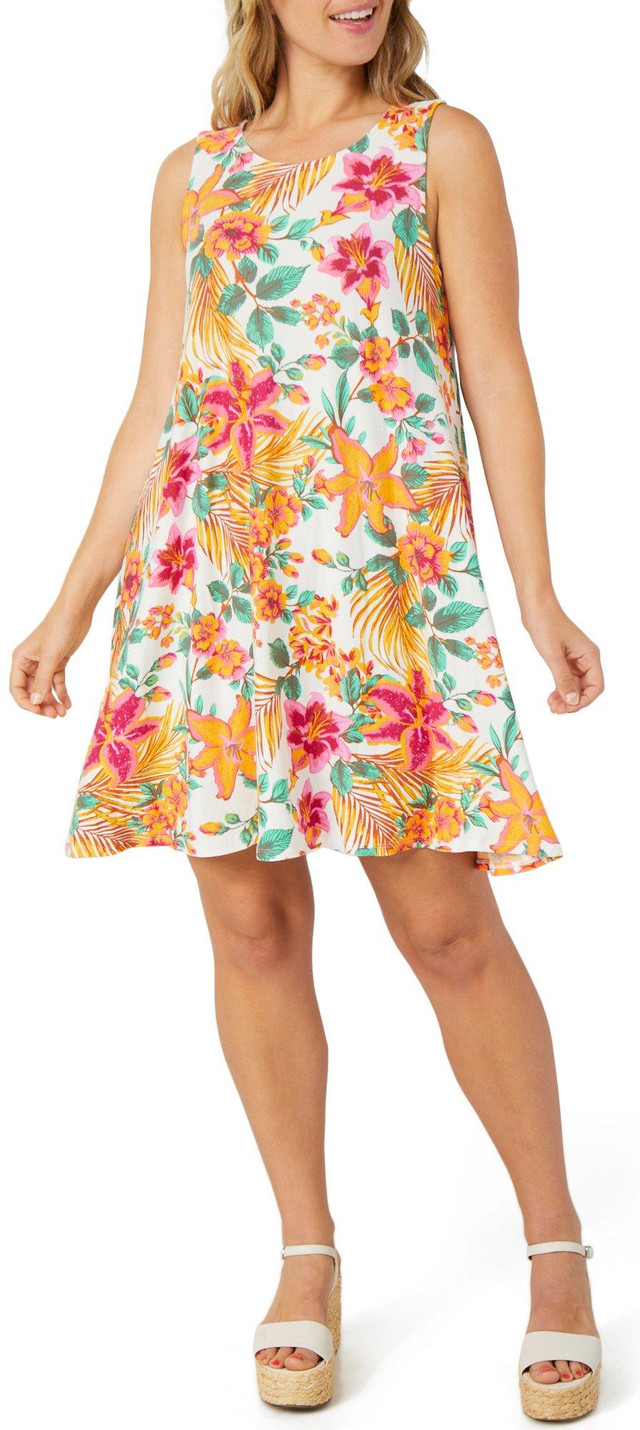 The Women's Sleeveless Swing Dress combines comfort and style with its flowy silhouette and tropical print. Designed to flatter every body type, this dress offers a relaxed fit and soft fabric that moves with you. Perfect for warm weather, it is ideal for casual outings or dressing up for special occasions. Fabrication is 92% polyester, 8% spandex
