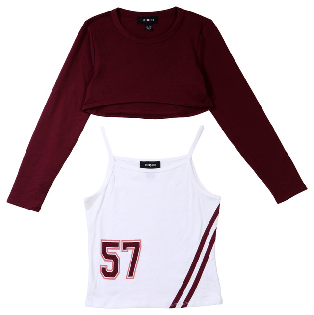 Add sporty flair to her wardrobe with the Big Girls 2 Pc Varsity Style Tops Set. Includes a sleeveless tank top with stripe detail and a bold number 57 screenprint, layered under a long sleeve pullover crop top for versatile styling. Ideal for school or weekend wear. Fabrication is 60% cotton 40% polyester (tank), 97% polyester 3% spandex (crop top).