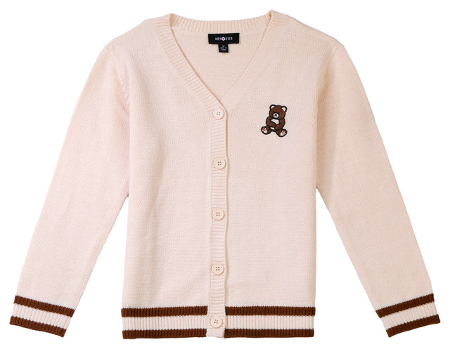 Add charm to cool weather outfits with the Big Girls Embroidered Bear Button Cardigan Sweater. Designed in a solid color with contrast stripes at the hem and wrists, it features a classic button front and an embroidered bear on the left chest. Ideal for layering over dresses or tops for school and special occasions. Fabrication is 100% acrylic.