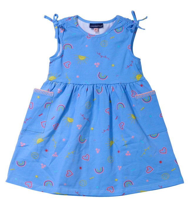 This Andy & Evan toddler girls dress features a rainbow and sunshine print, two side pockets with embroidered stitching, and sweet bows on each shoulder. With a crew neck, short sleeves, and a long flowing skirt, its perfect for any occasion. Soft, breathable fabric keeps her comfy while stylish moms love its charm, versatility, and playful details.
