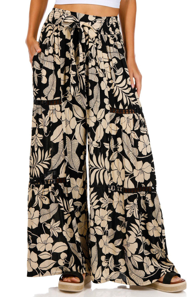 Introducing the Juniors Floral Pants with Crochet Detail from Angie, crafted from rayon for a lightweight and comfortable feel. These stylish pants feature a vibrant floral print, tiered crochet details, a smocked pull-on waistband with a tie, and side pockets for easy wear. The flowy fit adds a touch of elegance, making them perfect for any casual or dressy occasion. 28 inch inseam.