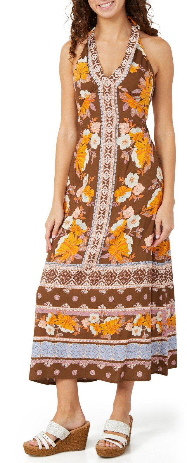 Embrace island vibes in the Juniors Floral Halter Maxi Dress. Featuring a bold floral print, halter neckline, and a back tie for a custom fit, this maxi-length dress flows effortlessly for a breezy look. Fabrication 100% rayon