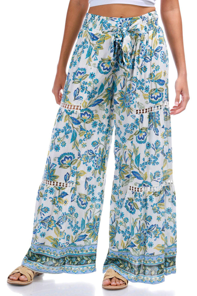 Introducing the Juniors Floral Pants with Crochet Detail from Angie, crafted from rayon for a lightweight and comfortable feel. These stylish pants feature a vibrant floral print, tiered crochet details, a smocked pull-on waistband with a tie, and side pockets for easy wear. The flowy fit adds a touch of elegance, making them perfect for any casual or dressy occasion. 28 inch inseam.