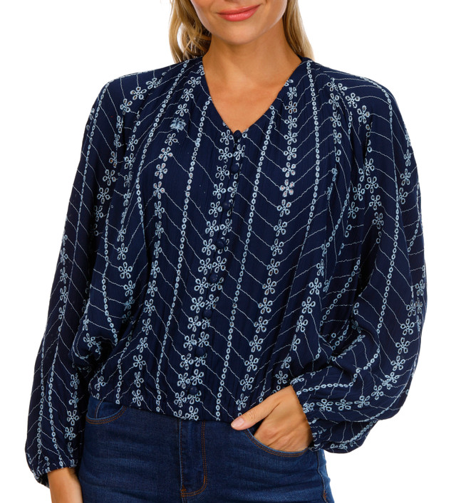 Capture a free spirited look with the Juniors Long Sleeve Embroidered Button Down Top featuring floral embroidered eyelet fabric, smocked detailing at the wrists and hem, and a button down front with fabric covered buttons and loop closures. Finished with a v-neckline and adjustable back tie for a custom fit. Fabrication is 100% rayon. Measures approximately 23 in.