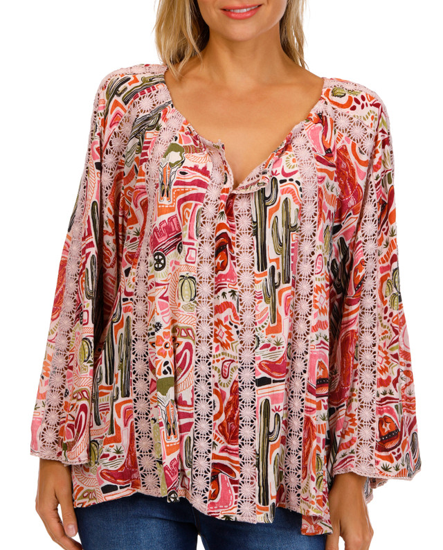 Celebrate western flair with the Juniors Long Sleeve Split Neck Western Print Top featuring a stylized print of cactus, cowboy hats and boots and wagons. Designed with lace detailing throughout including down the sleeves from the shoulder and finished in a flowy relaxed silhouette for all day comfort. Fabrication is 100% rayon. Length measures approximately 26 in.
