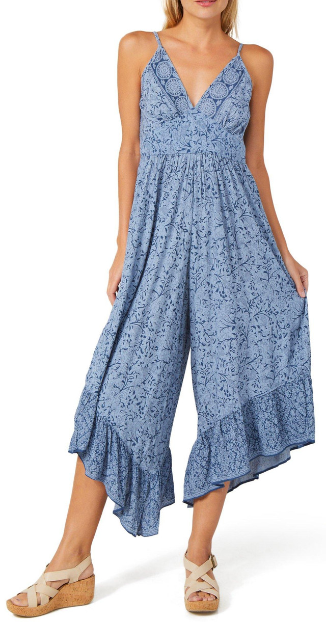 This juniors sleeveless jumpsuit features a floral print, smocked upper, and flowy wide-leg design with a 24-inch inseam. Lightweight and breezy, it is perfect for warm days when you want comfort with a playful, feminine vibe.