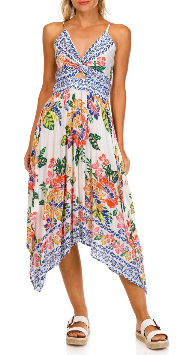 This Sleeveless Maxi Dress features a vibrant print pattern, adjustable straps, and a stylish front twist detail. Flattering and flowy, its perfect for effortless summer style and all day comfort.