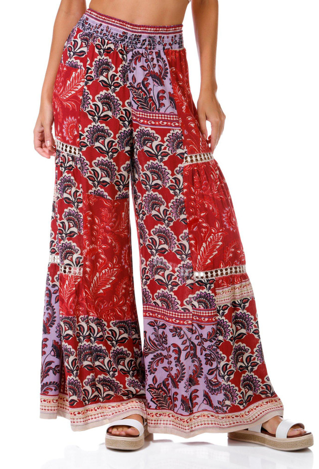 Introducing the Juniors Smocked Floral Patchwork Crochet Pants, crafted from 100% rayon for a lightweight and comfortable fit. These stylish pants feature a smocked, pull-on waistband for easy wear, wide-leg fit that offers both elegance and freedom of movement and open crochet detail. The vibrant floral border design adds a touch of sophistication, making these pants perfect for any casual or semi-formal occasion.