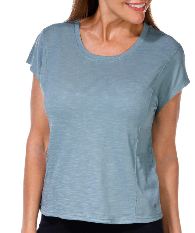Stay comfortable and stylish in this women's active soft boxy top. Designed with a solid color, short sleeves, a classic crew neckline and a subtle front seam detail, it offers a relaxed fit perfect for workouts or casual wear.