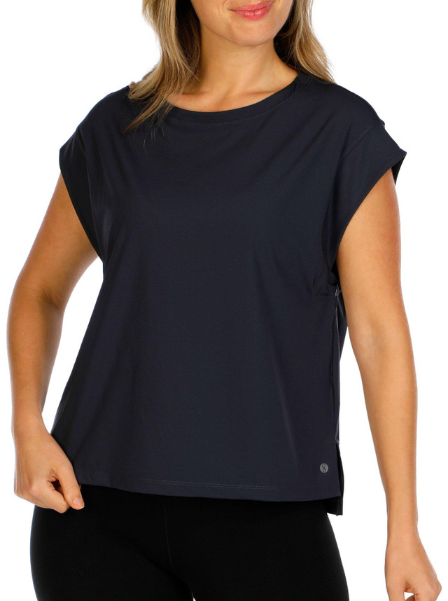This Modern Love Cap Sleeve Tee brings effortless charm to your everyday wardrobe. Crafted in a soft, solid color fabric, it features delicate cap sleeves and a flattering silhouette thats perfect for layering or wearing solo. Fabrication is 66% polyester, 34% spandex.
