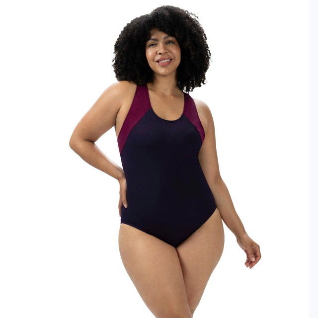 Enhance your swim sessions with our colorblock one-piece swimsuit. Featuring built-in bust support, this stylish and sophisticated swimsuit offers a flattering fit and moderate coverage. Perfect for aerobics, lap swimming, and fun with friends and family, it's designed for functionality and comfort. Enjoy every splash with confidence and elegance in this must-have swimwear. Fabrication 100% polyester.