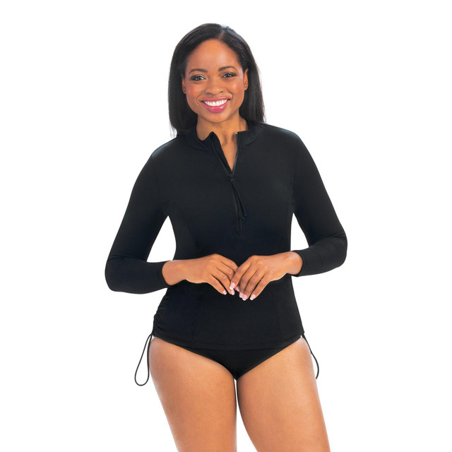 Stay protected in style with our long sleeve rashguard. Featuring sun protection and side ruched detail with adjustable cords for a perfect fit, this classic piece offers both functionality and elegance. The fitted styling and quarter zip make it ideal for sun, pool, and beach days with friends and family. Embrace the outdoors confidently and comfortably.