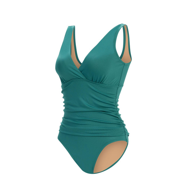 Experience unparalleled elegance with our solid color surplice one-piece swimsuit. Designed with front and back ruching for tummy control, this fitted piece features sewn-in cups for optimal support. The pilling and chlorine-resistant fabric ensures durability, while UPF 50+ sun protection keeps you safe during beach and pool days. Sophisticated and fashion-forward, it's perfect for fun times with friends.