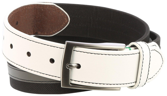 This belt features a classic canvas and faux leather design with accent paneling, stitched accents, nickel colored hardware, and a signature umbrella logo rivet. Belt width measures 1.5 in.
