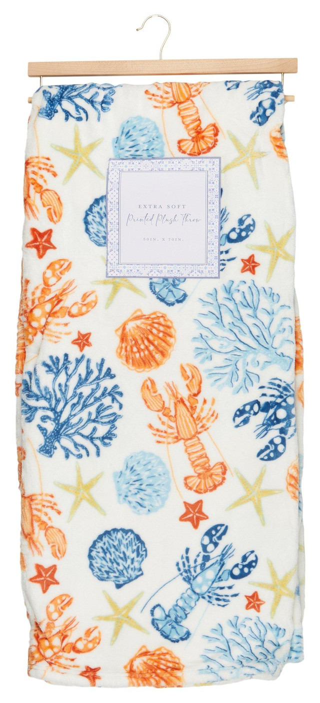 Bring seaside style to your space with the 50x70 Extra Soft Printed Plush Throw Blanket in a lobsters and shells pattern featuring multicolored sea life on an off white background. Ideal for coastal homes and relaxed living. Fabrication is 100% polyester. Measures approximately 50 in x 70 in.
