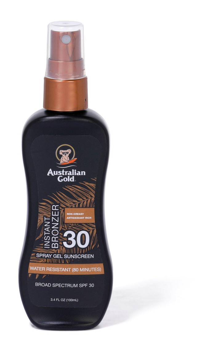 Achieve a golden glow with Instant Bronzer Spray Gel SPF 30. This broad-spectrum, water-resistant (80 mins) sunscreen combines protection with a caramel-based instant bronzer for a temporary sun-kissed hue that washes away. 3.4 FL Oz.
