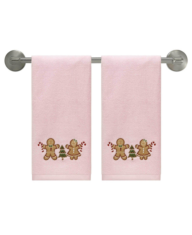 Celebrate the season with the Avanti Gingerbread People Decorative Hand Towel 2-Pack. These festive Christmas towels feature embroidered gingerbread characters, candy canes, and a holiday tree, accented with faux crystal and pearl buttons for sparkle. Made of soft pink velour, they add cheerful charm to your holiday bathroom or kitchen décor. Each hand towel measures 16 in. x 28 in. Fabrication 100% cotton.