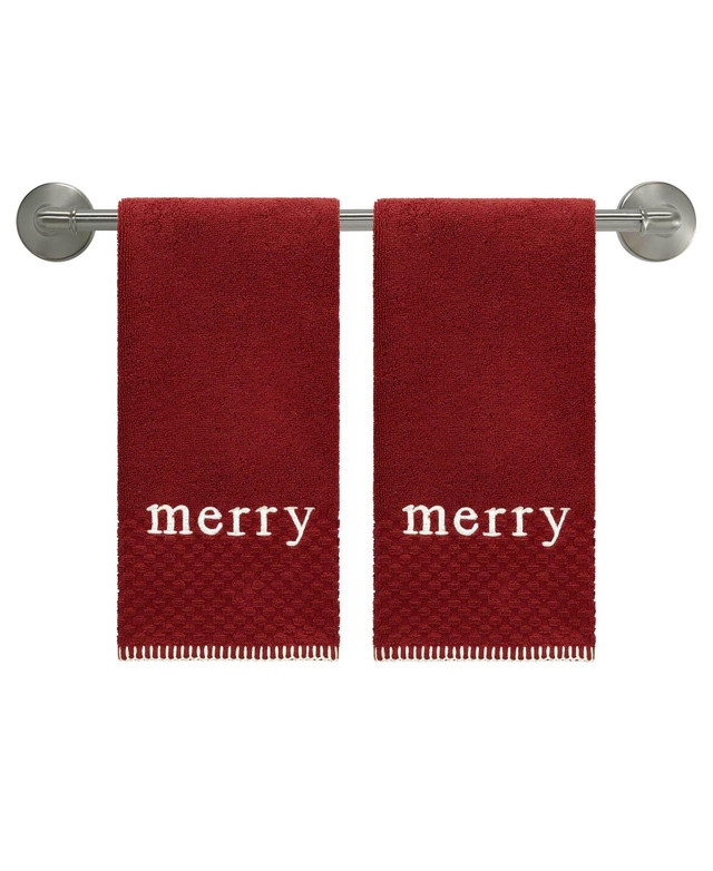 Add a touch of Christmas cheer with the Avanti Merry Decorative Hand Towel 2-Pack. Featuring merry embroidered in festive lowercase white font, these red cotton terry towels offer a cozy texture and a crisp white whip-stitch edge. Perfect for holiday bathroom décor or as a seasonal gift, they bring joyful style to your home. Each hand towel measures 16 in. x 28 in. Fabrication 100% cotton.