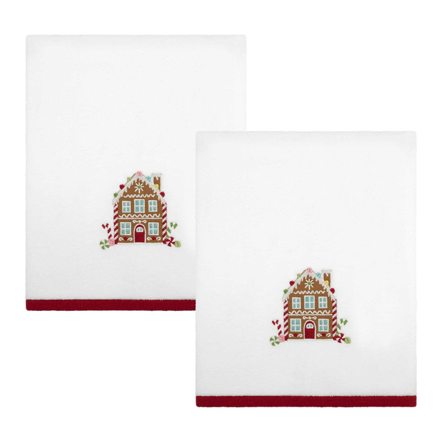 Add a touch of holiday sweetness with the Avanti 2 Pc. Sweet Treat Embroidered Bath Towel Set. Featuring a festive gingerbread house decorated with colorful candies on soft velour, these towels are finished with a bold red border for a cheerful Christmas accent. Perfect for seasonal décor, they pair beautifully with the matching hand towel 2-pack, fingertip 2-pack, and accessories. Each measures 27 in. x 50 in. Part of the Sweet Treat Bath Towel Collection.