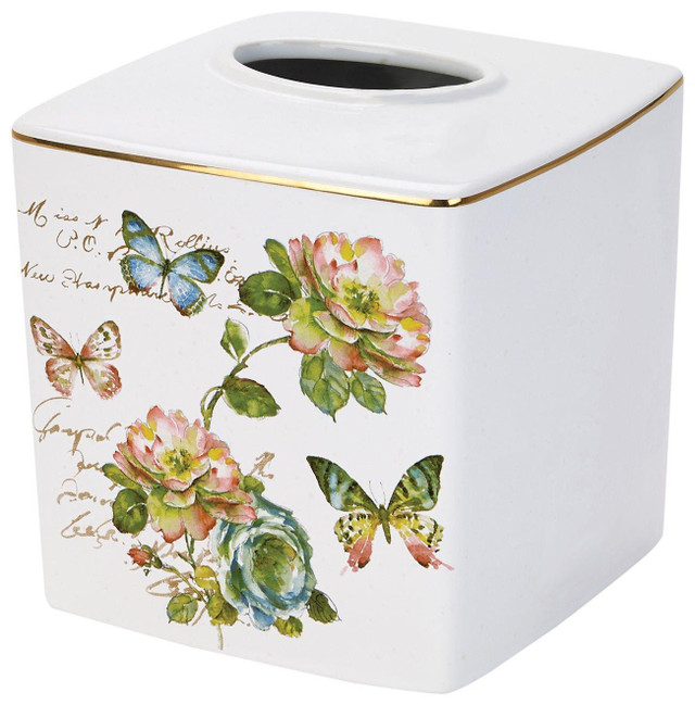 Avanti Butterfly Garden Tissue Cover is decorated with an intricately detailed rose and butterfly design on a ceramic base and finished with gold piping. Measures: 5.9'' x 5.9'' x 6.1''.