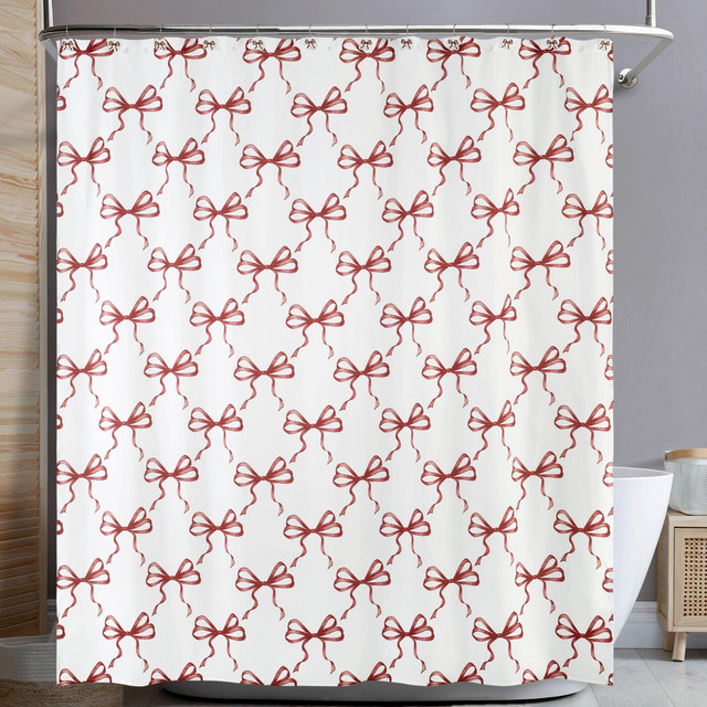 Brighten your holiday bathroom décor with the Avanti Christmas Bows Shower Curtain! Featuring cheerful red ribbons and double bows in a playful diamond pattern on a crisp white background, this festive accent adds seasonal sparkle. Printed for vivid detail, it's machine washable and easy to care for. Pair with coordinating accessories for a complete Christmas look full of joy and style! Part of the Christmas Bows Collection. Measures 72 in. x 72 in..