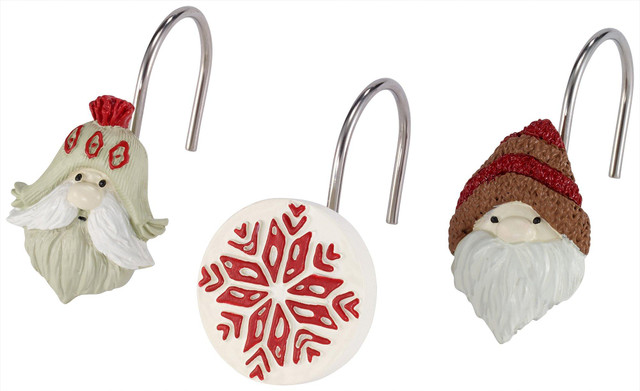 The Avanti Christmas Gnomes Shower Curtain Hooks features 3 icons pulled from the design-2 gnomes and the snowflake design to add the perfect finishing touch to the collection. Hand painted. Set of 12, 4 of each design. Measures 2.67 x 1.95 x 1.45 inches.