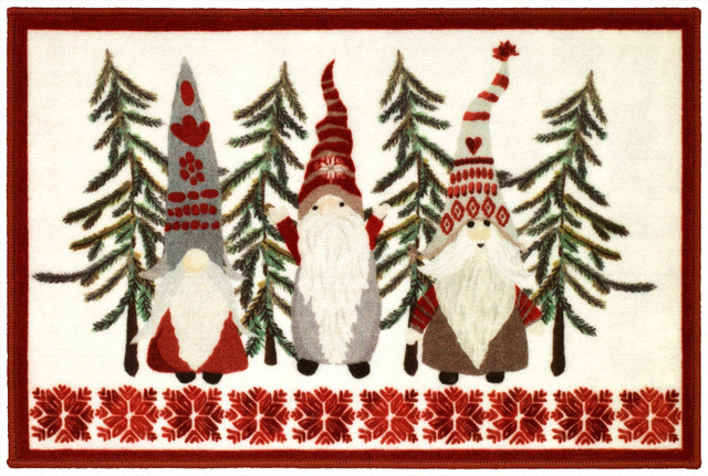 The Avanti Christmas Gnomes Bath Rug / Bath Mat features 3 festively attired gnomes with evergreen trees on a white ground. The bottom is bordered with the red and white snowflake motif and a red frame surrounds the entire rug. Measures 20 x 30 inches with latex backing.