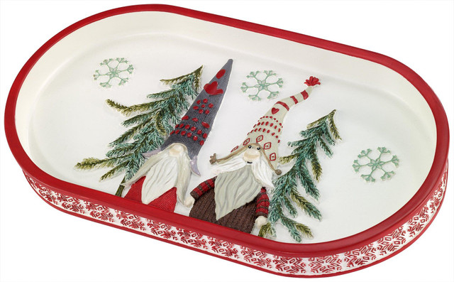 The Avanti Christmas Gnomes Tray features 2 festively attired gnomes with evergreen trees in relief and grey snowflakes on a white ground. The base is bordered with a red and white snowflake motif. Hand painted. Measures 10.04 x 5.59 x 1 inches.