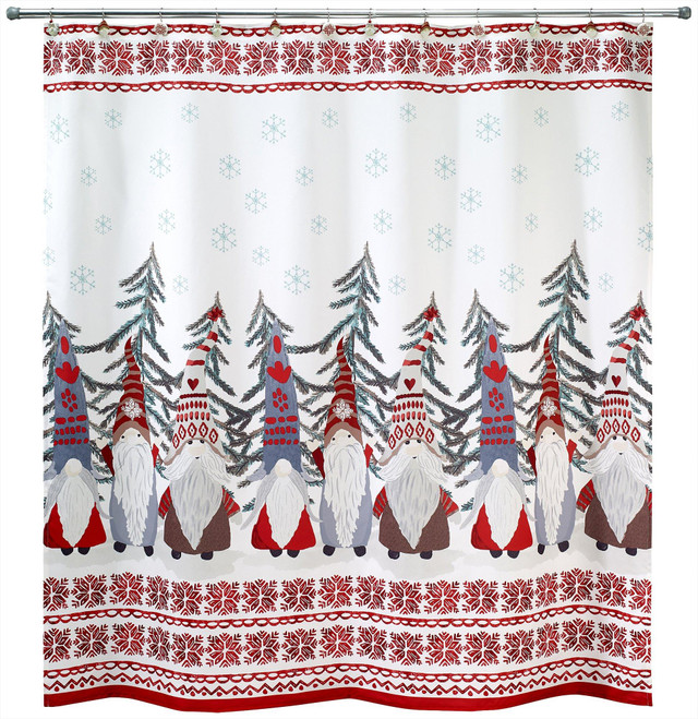 The Avanti Christmas Gnomes Shower Curtain features a series of 3 festively attired gnomes with evergreen trees and grey snowflakes on a white ground. The top and bottom are bordered with the red and white snowflake motif. Measures 72 x 72, printed on 100% polyester.