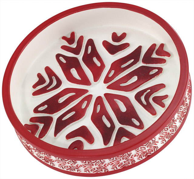 The Avanti Christmas Gnomes Soap Dish features a large red snowflake in relief on a white ground with its base bordered with a red and white snowflake motif. Hand painted. Measures 1 x 5.04 x 5.04 inches.