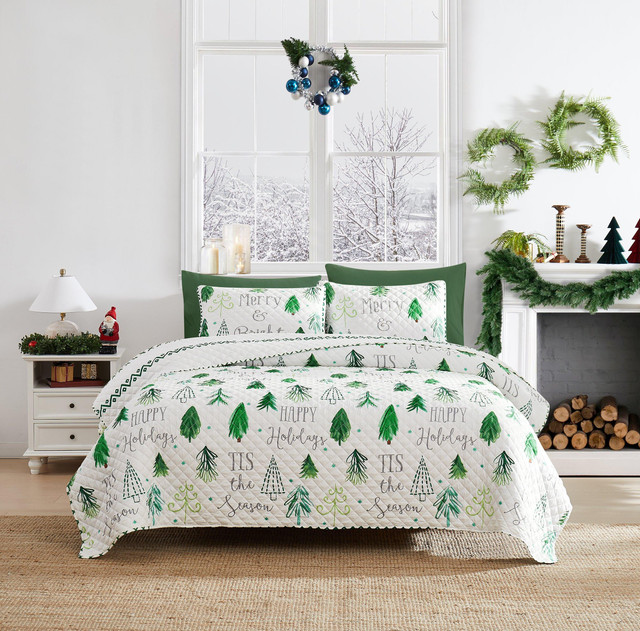 The Avanti Christmas Trees Quilt Set features a forest of stylized holiday trees and greens with seasonal sayings printed on a white quilted background, with a reverse stripe design. Printed on and filled with 100% polyester with a box-stitch quilting pattern.