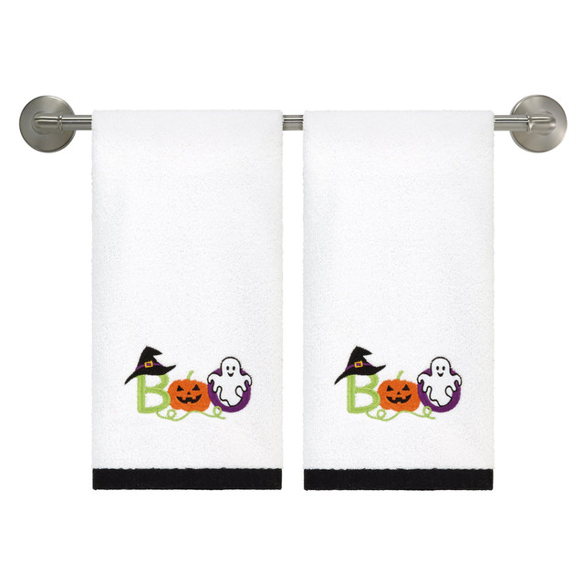 Spook up your space with the Avanti Colorful Boo Halloween Hand Towel Set! Each towel shouts BOO in bright Halloween iconsgreen, orange, and purpleon soft white cotton with a bold black border. Perfect for adding a pop of festive fun to your bathroom. Machine washable and frightfully fabulous! Each hand towel measures 16 in. x 26 in. Machine washable.