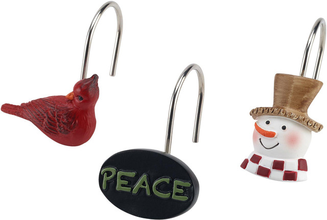 The Avanti Country Friends Shower Hooks features 3 icons from the shower curtain design-snowman, peace sign and cardinal-to create the perfect finishing touch for the shower curtain. Set of 12, 4 of each design. Made in durable resin, hand painted.